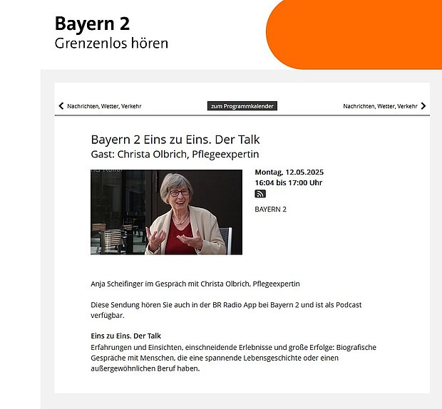 Mo, 12.05.2025 von 16:04 bis 17 Uhr auf BR 2 und jetzt schon in der Mediathek: Eins zu Eins. Der Talk. Mit Pflegeexpertin und Autorin Christa Olbrich