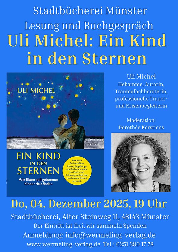 Moderiert wird die Veranstaltung von der Verlegerin Dorothée Kerstiens. Im Anschluss an die Lesung besteht die Möglichkeit, mit derAutorin, Hebamme und Traumafachberaterin Uli Michel ins Gespräch zu kommen und Bücher signieren zu lassen. Anstelle eines Eintritts werden an diesem Abend Spenden zugunsten der Sternenkinder-Arbeit gesammelt. Um Anmeldung wird gebeten unter info@wermeling-verlag.de, Tel. 0251 380 17 78.